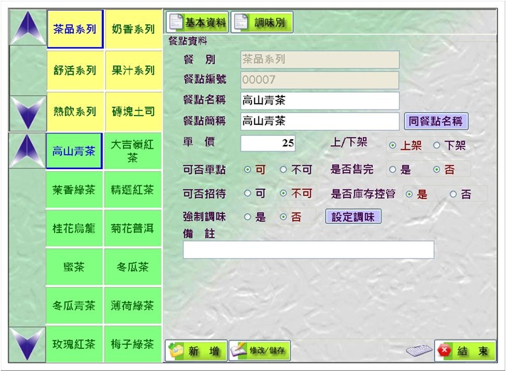 協助操作者設定各項餐點、並且可以進一步設定調味,例如口味酸鹹度、也可依商家需求設定各類型餐別。