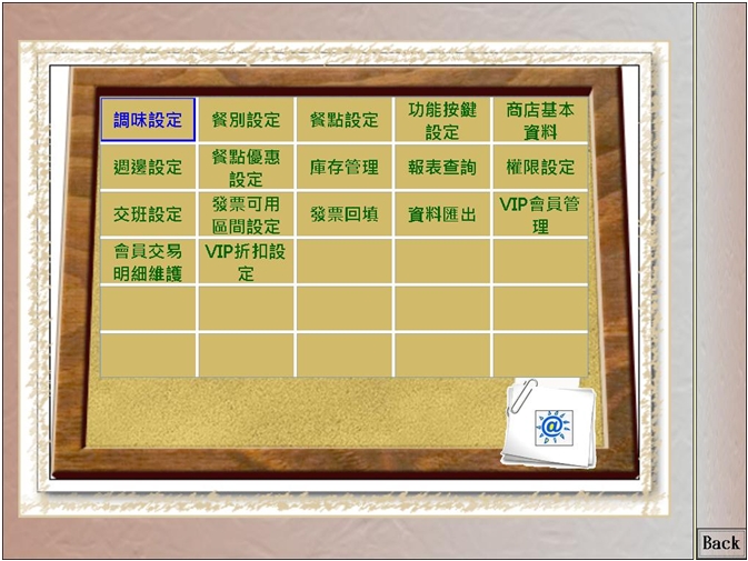 主功能選單畫面。客戶可針對自己的需求點選使用,包括調味、餐別、餐點設定等各項基本設定。另外庫存管理、VIP會員管理等功能皆由此進入。