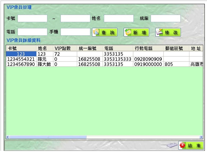 有效儲存管理VIP會員資料,涵括會員基本資料,紀錄會員消費累積點數,後續可再進行相關統計分析。