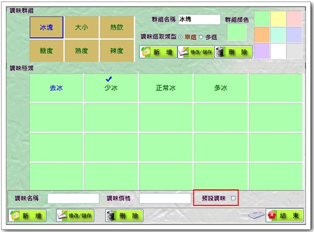 餐別設定 調味設定 在系統設定畫面中,點選該功能設定連接至此畫面,可依使用者需求增減、修改餐點內容。